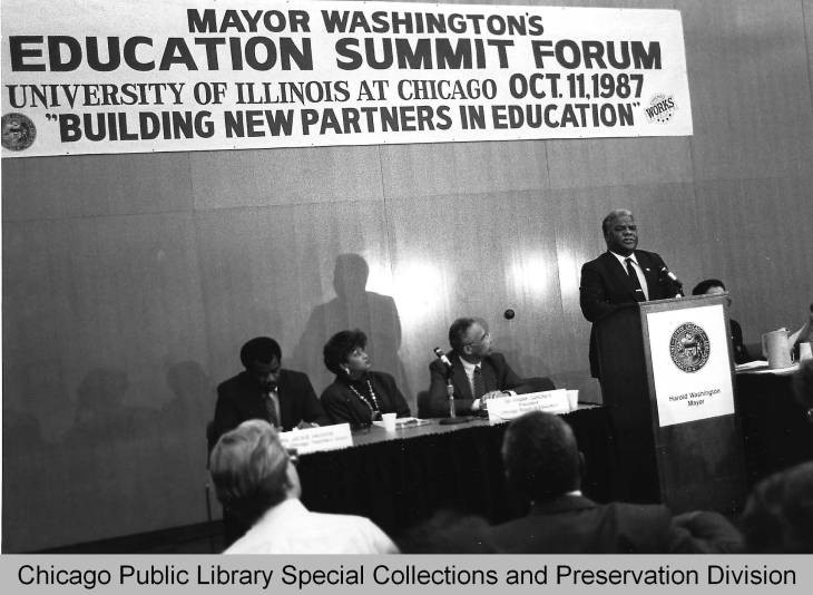 But thirty years ago, Chicagoans did pack into the Forum and raucously applaud Harold Washington as he kicked off a year-long “Education Summit.”On the heels of a 19-day teacher strike stoking fears about that CPS would implode, the Summit was Washington’s last great initiative. A committee of 50, made up of cross-section of section of civic, business, and educational leaders, carried on the effort with meetings in every corner of the city. The Education Summit led to the 1988 Chicago School Reform Act, which dramatically decentralized CPS by creating Local School Councils that allowed the public a direct hand in governing schools.